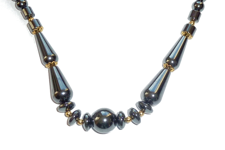 Hematite 6mm Round Bead Necklace with Fancy Centre Section, Comprising of Hematite Teardrop Beads, Gold Plated Beads and a 12mm Hematite Centre Bead. Finished with a Gold Plated Trigger Clasp and Jump Ring, 45cm (18″). Pack of 2 Necklaces.