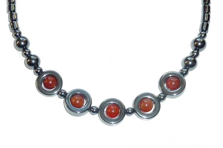 Hematite Tube Necklace with a Centre Section of 6mm Carnelian beads in Hematite Wheels, Finished with a Gold Plated Trigger Clasp and Jump Ring, 45cm (18″) . Pack of 2 Necklaces.