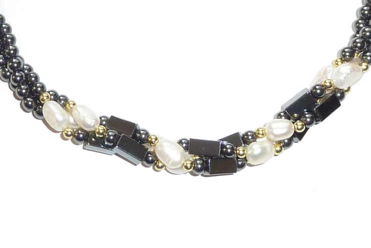 Twisted Three Row 4mm Hematite Necklace with Three Fancy Sections Comprising of Hematite Square Beads, Long Drill Freshwater Pearls & Gold Plated Beads and Finished with a Gold Plated Trigger Clasp and Jump Ring, 90cm (36″).