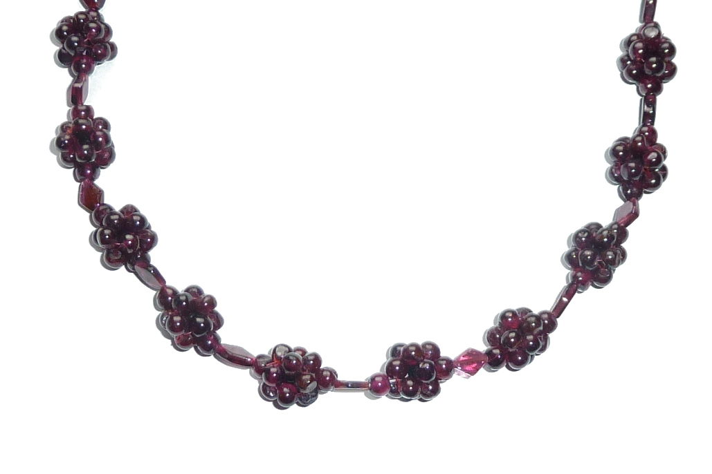Garnet “Blackberry” Style Necklace, continuous. Garnet ” Blackberries” Interspersed with 4mm Garnet and Diamond Shaped Beads, 70cm (28″).