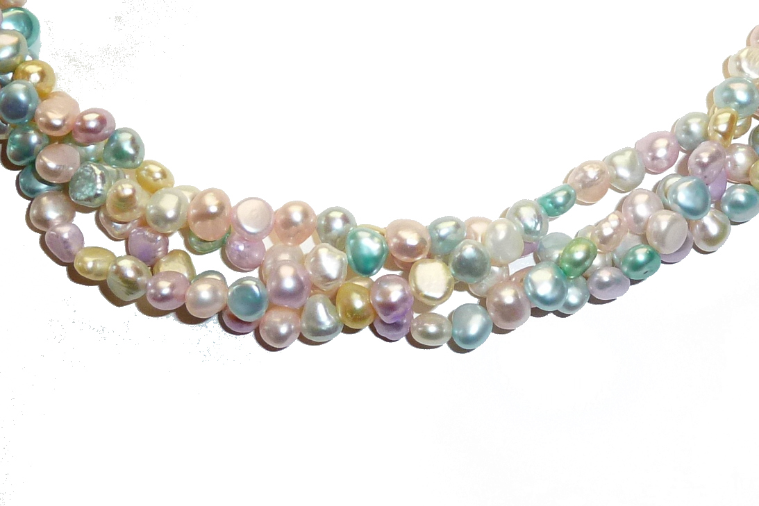 Freshwater Pearl, 5-5.5mm Pastel, Side Drill 4 Row Twisted, comprising of White, Pink, Turquoise,Yellow & Green Pearls. The Necklace is finished with a Silver Plated Trigger Clasp and Jump Ring, 43cm (17″).