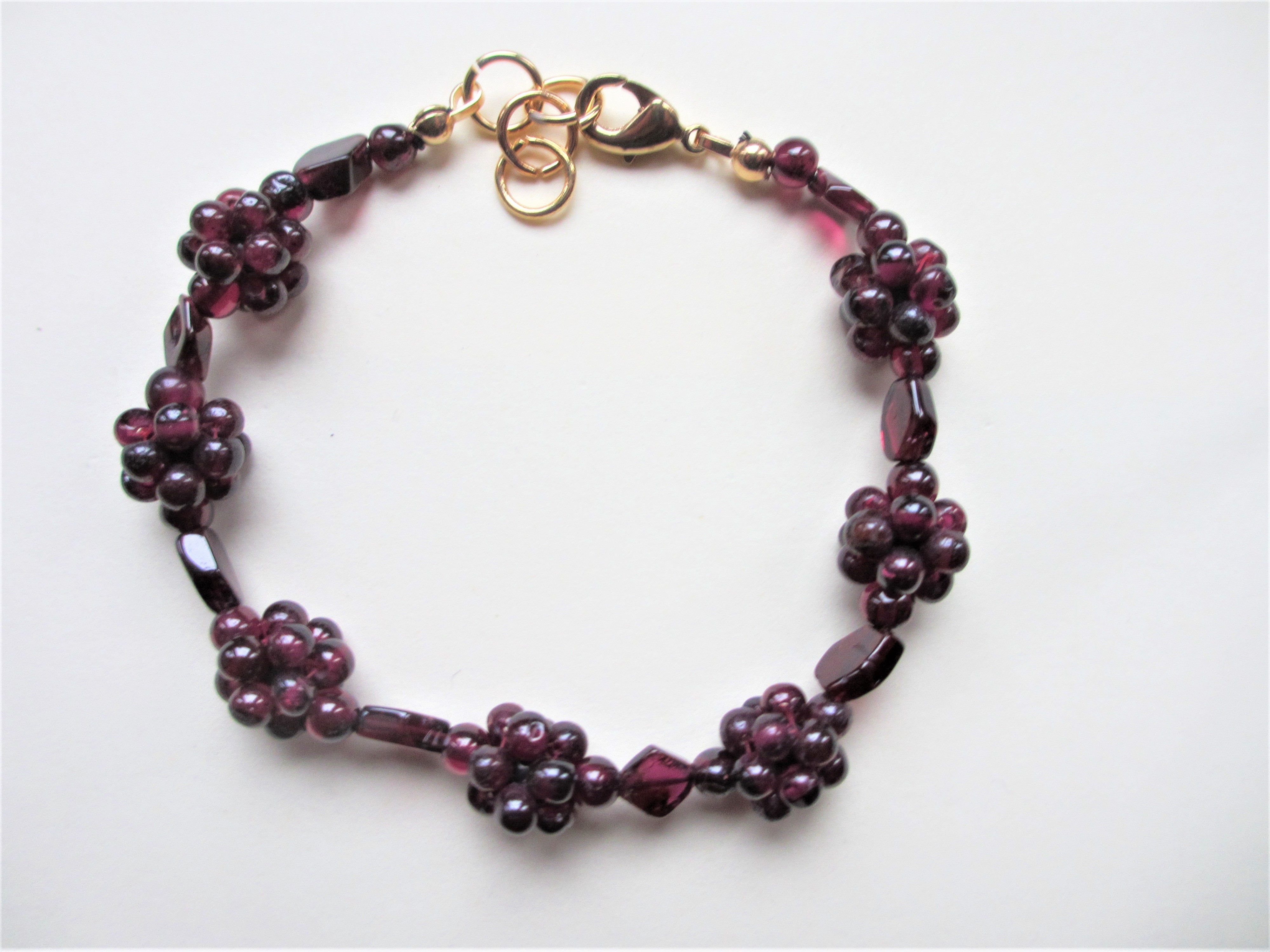 Garnet “Blackberry” Style Bracelet, with Garnet Hexagonals and Round Beads. Finished with a Gold Plated Trigger Clasp and Jump Ring, 19cm (7.5″) . Pack of 3 Bracelets.
