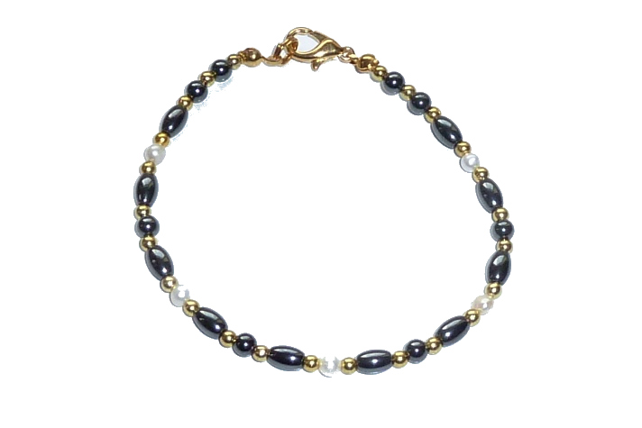 Round and Oval Hematite beads with Freshwater Pearls Interspersed with Gold Plated Beads. Finished with a Gold Plated Trigger Clasp and Jump Ring, 19cm (7.5″). Pack of 3 Bracelets.