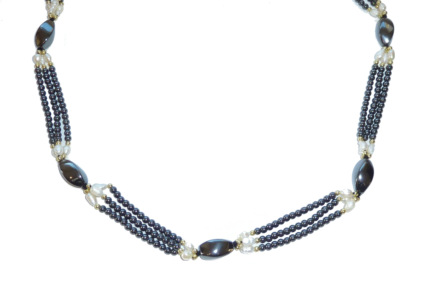 RGM Products Ltd › Freshwater Pearl Necklaces | Gem Round Bead Necklaces | Gemstone Necklaces | Hematite GN | Hematite GRBN | White Long Drill FPN › HEM/F40 Hematite & FWP 3 Line 75cm (30″)