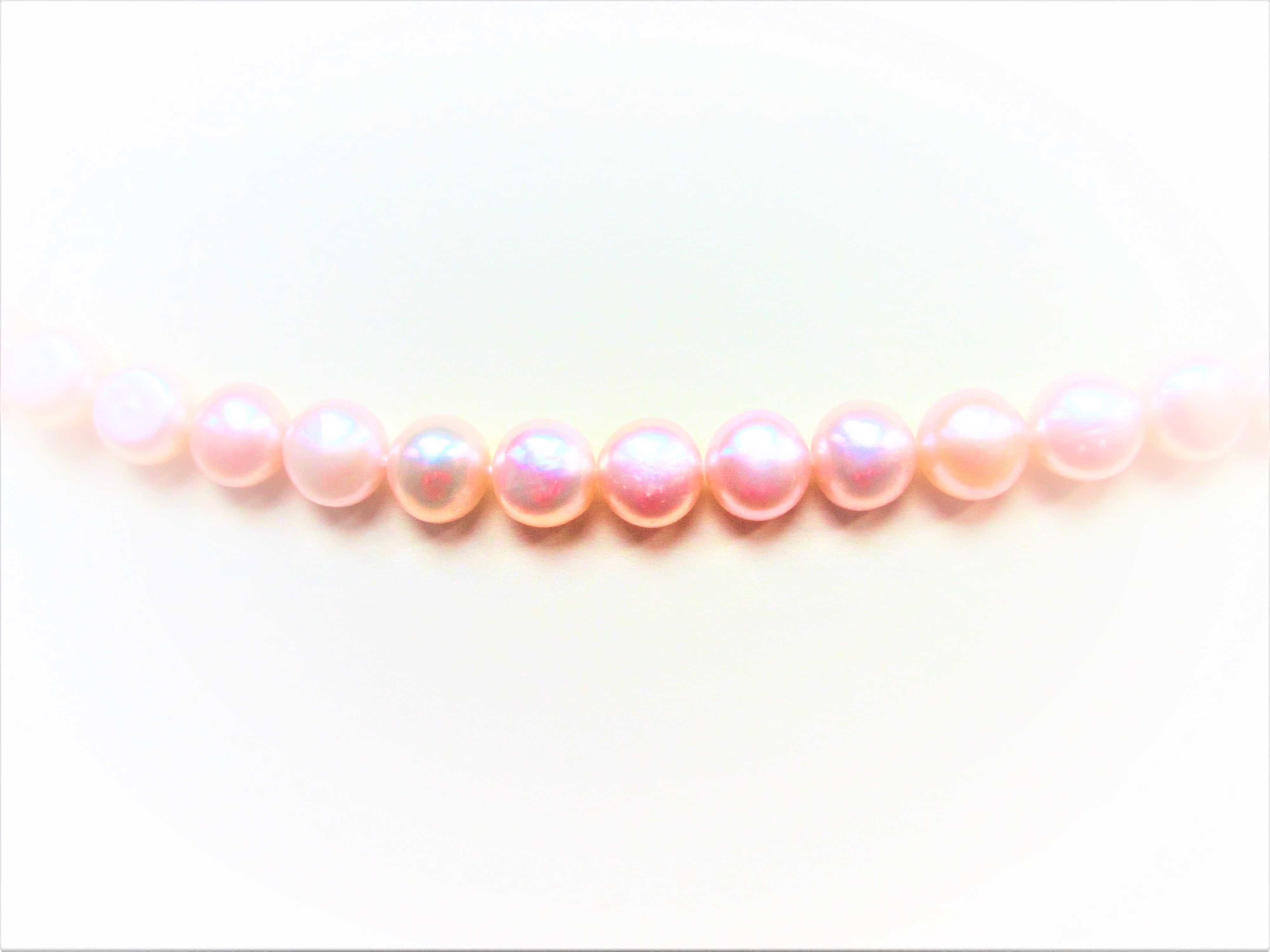 Freshwater Pearls, 7.5-8 mm Pink, Button, Side Drill Necklace. Good Lustre. Finished with a Choice of Silver Plated or Gold Plated Bolt Ring and Jump Ring, 42cm (17″) or Loose Strung, 40cm (16″).