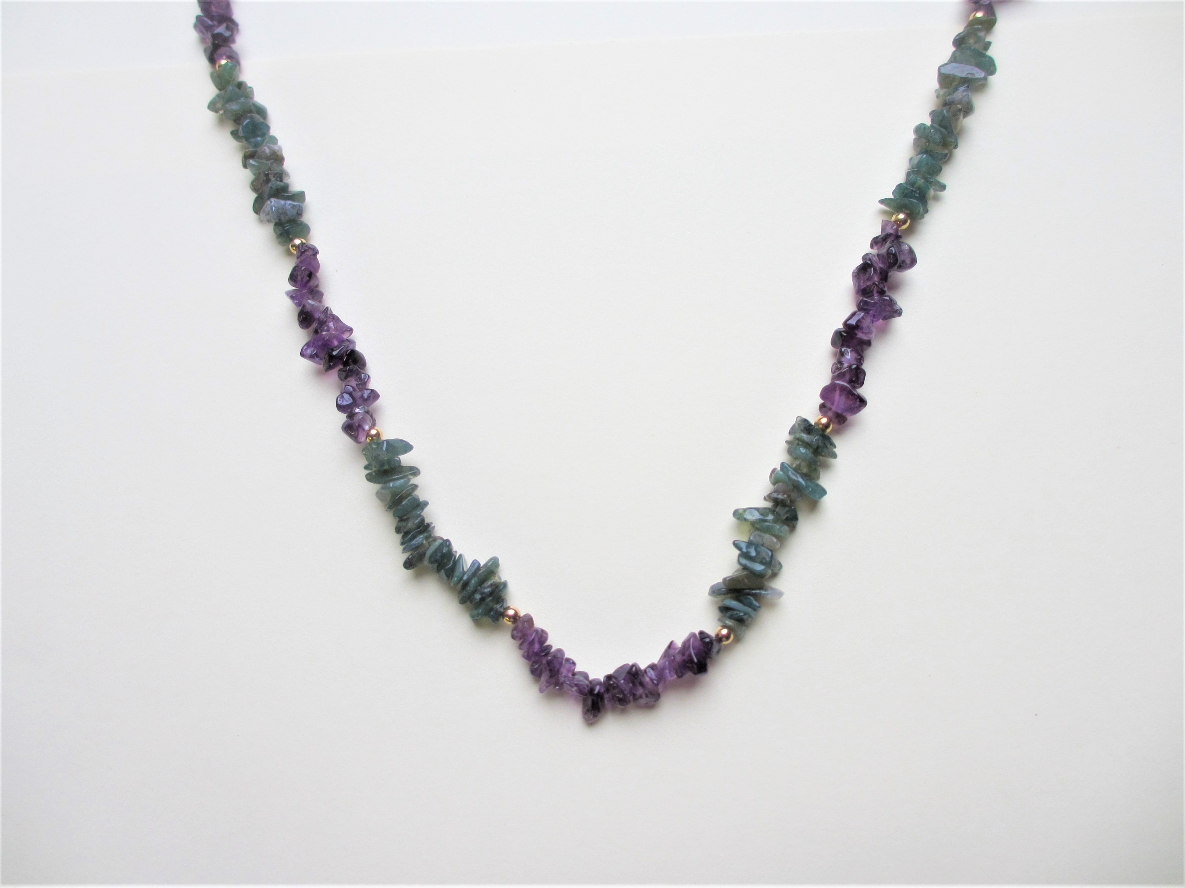 Amethyst & Moss Agate Chip Necklace in Bands Separated by a 3mm Gold bead, 60cm (24″) with gold plated trigger clasp. Pack of 2.