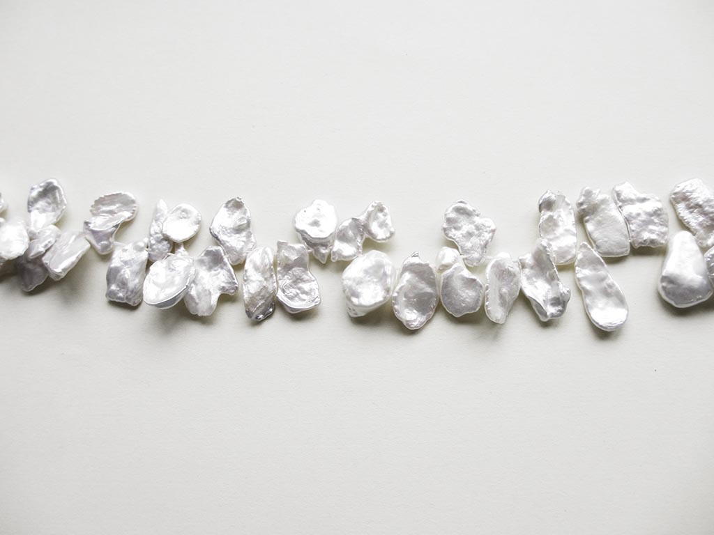 Freshwater Pearl, Top Drill White Large Keishi (Cornflake shape) Pearl Necklace. Finished with a choice of Silver Plated or Gold Plated Bolt Ring and Jump Ring, 42cm (17″) or Loose Strung, 40cm (16″) .