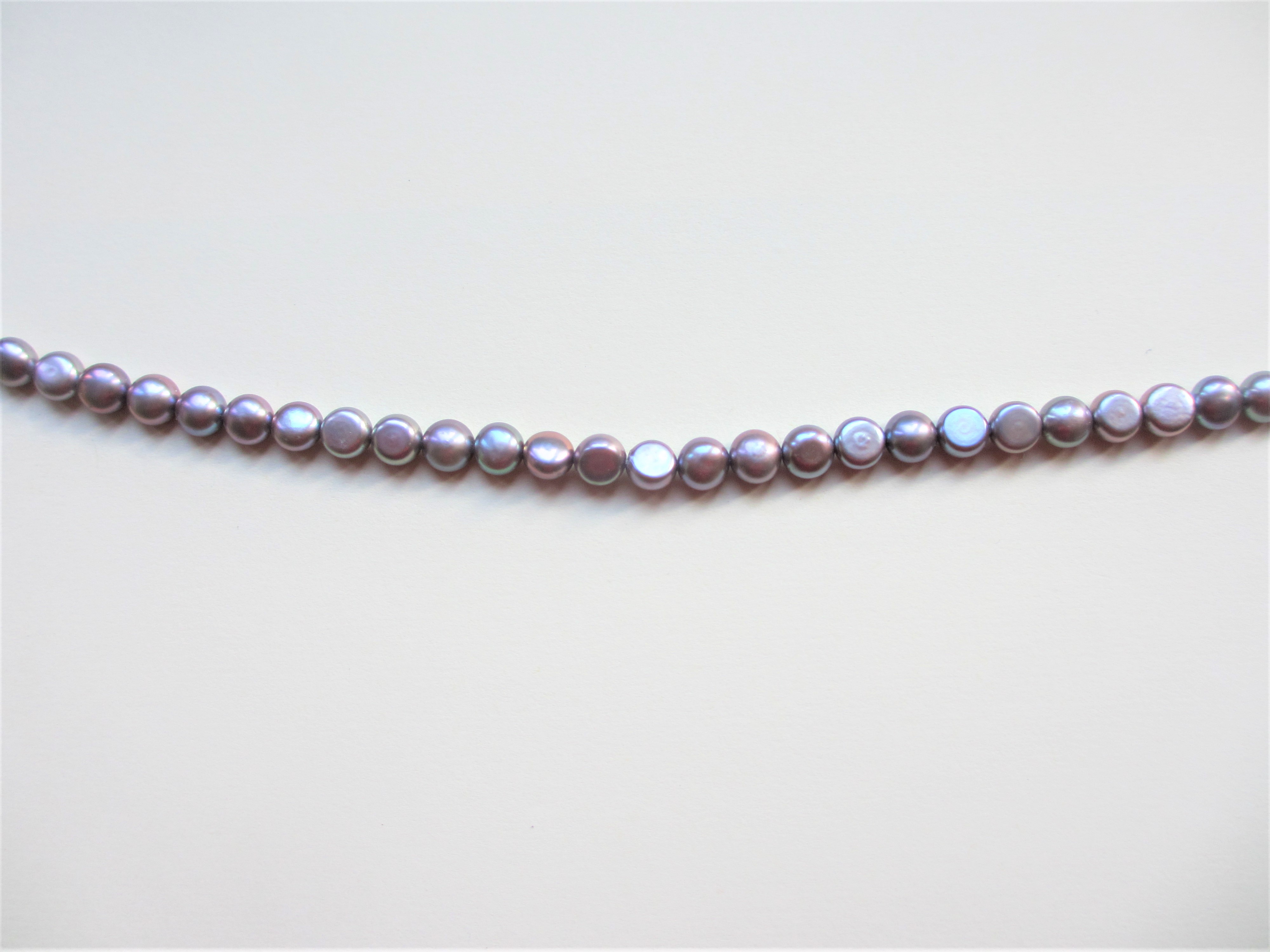Freshwater Pearls, 7-7.5 mm Grey, Button, Side Drill Necklace. Good Lustre. Finished with a Choice of Silver Plated or Gold Plated Bolt Ring and Jump Ring, 42cm (17″) or Loose Strung, 40cm (16″).