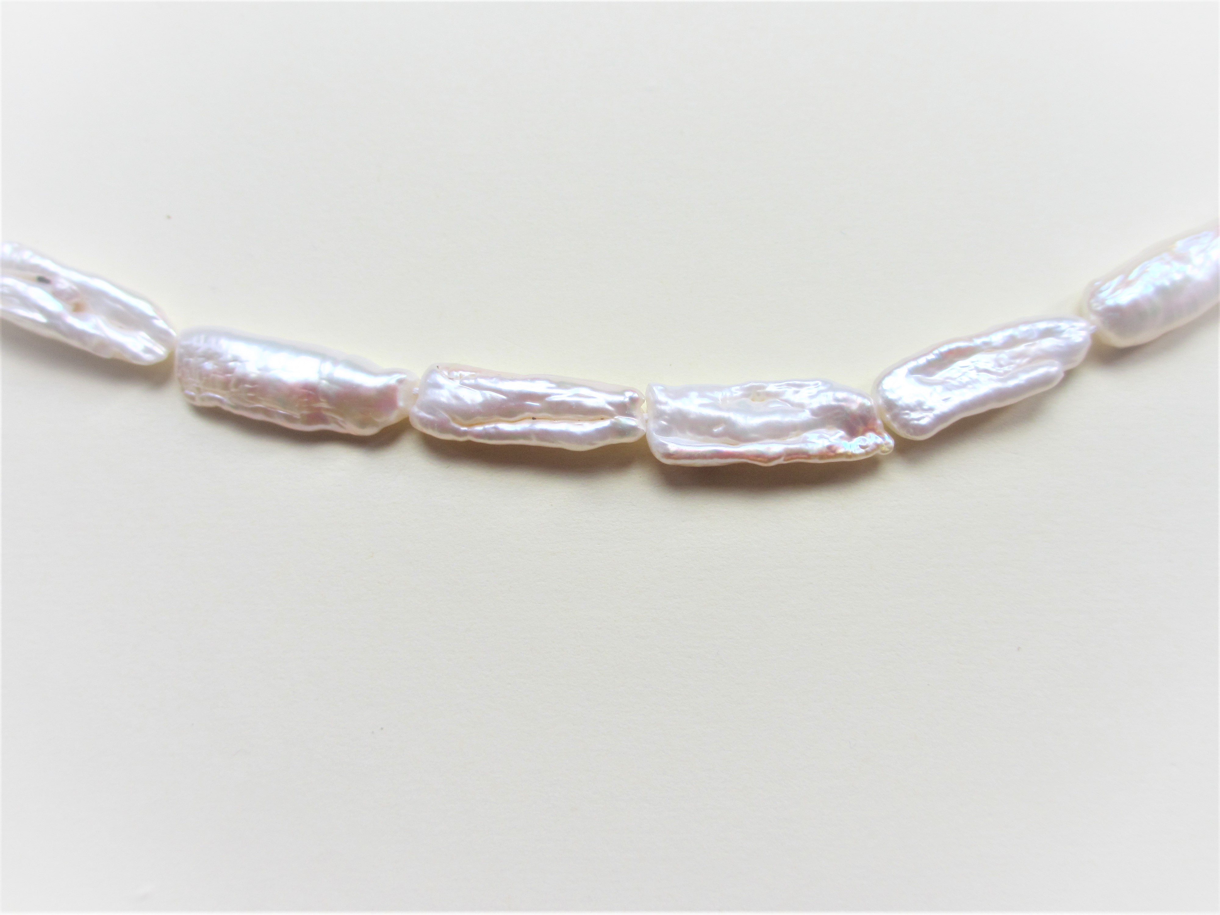 Biwa Freshwater Pearls, White Long Drill, Necklace, each Biwa pearl approximately 20x5mm. Finished with choice of Silver Plated or Gold Plated Bolt Ring and Jump Ring, 42cm (17″) or Loose-Strung, 40cm (16″).
