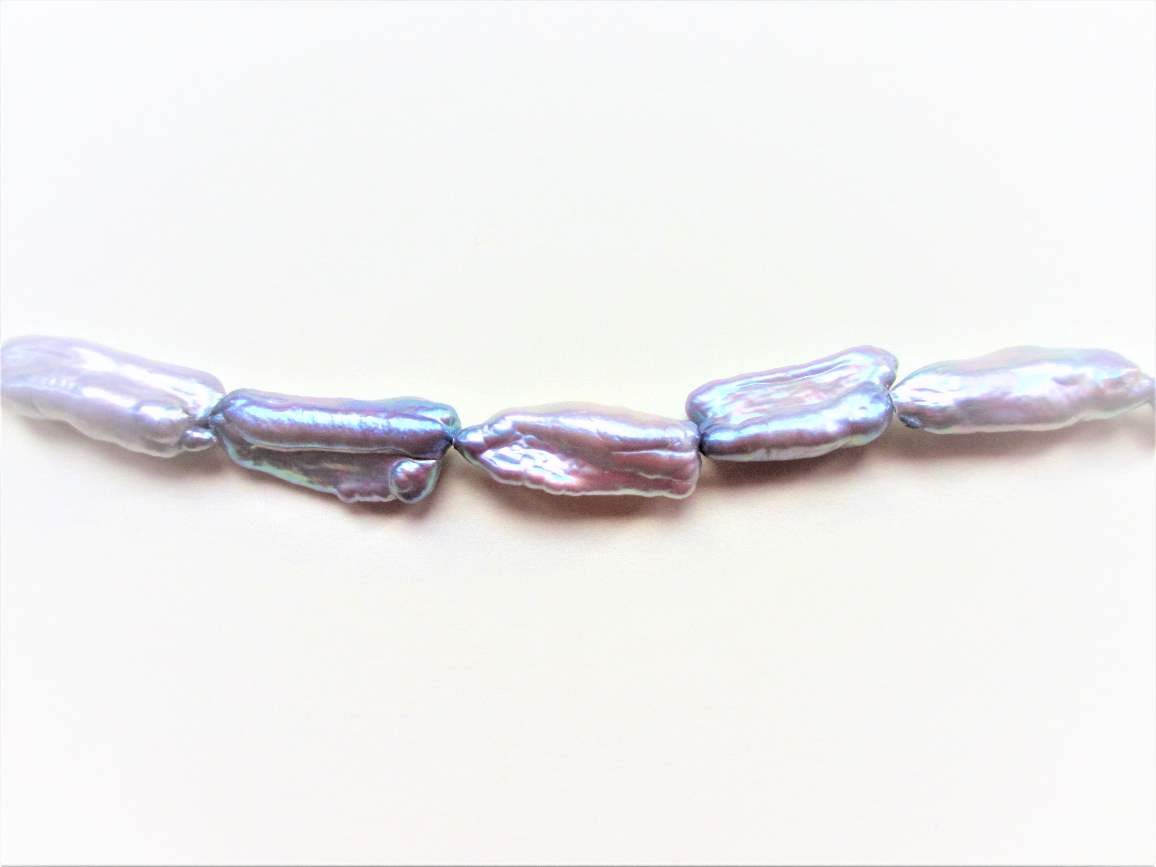 Biwa Freshwater Pearls, Long Drill Grey Necklace, each Biwa Pearl approximately 20 x 5mm. Finished with a Choice of Silver Plated or Gold Plated Bolt Ring and Jump Ring, 42cm (17″) or Loose Strung, 40cm (16″).