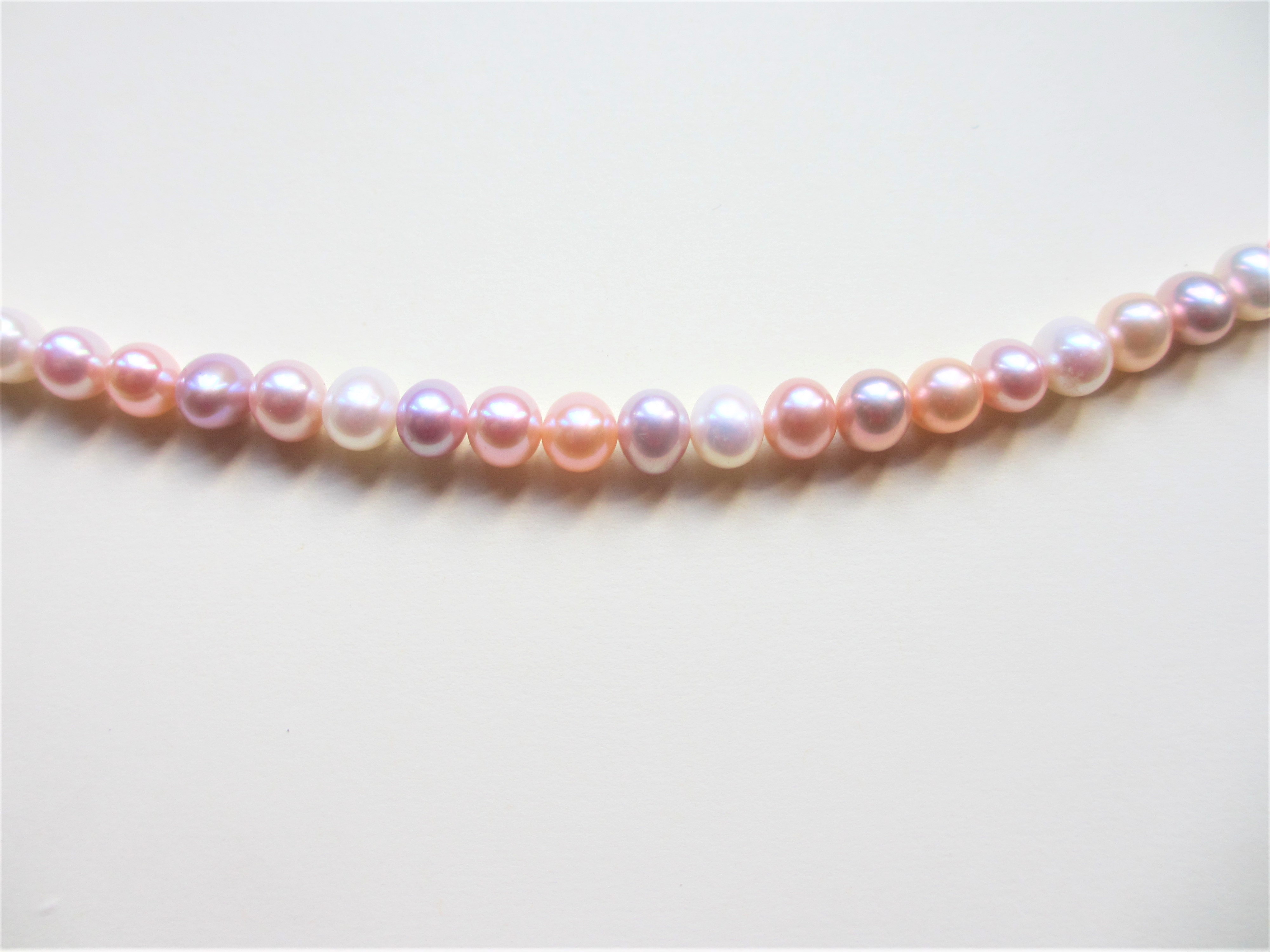 Freshwater Pearls, 7-8mm Natural Pastel Multicolour Potato, White, Peach and Pink, Finished with a Choice of Silver Plated or Gold Plated Bolt Ring and Jump Ring, 42cm (17″) or Loose-Strung, 40cm (16″).