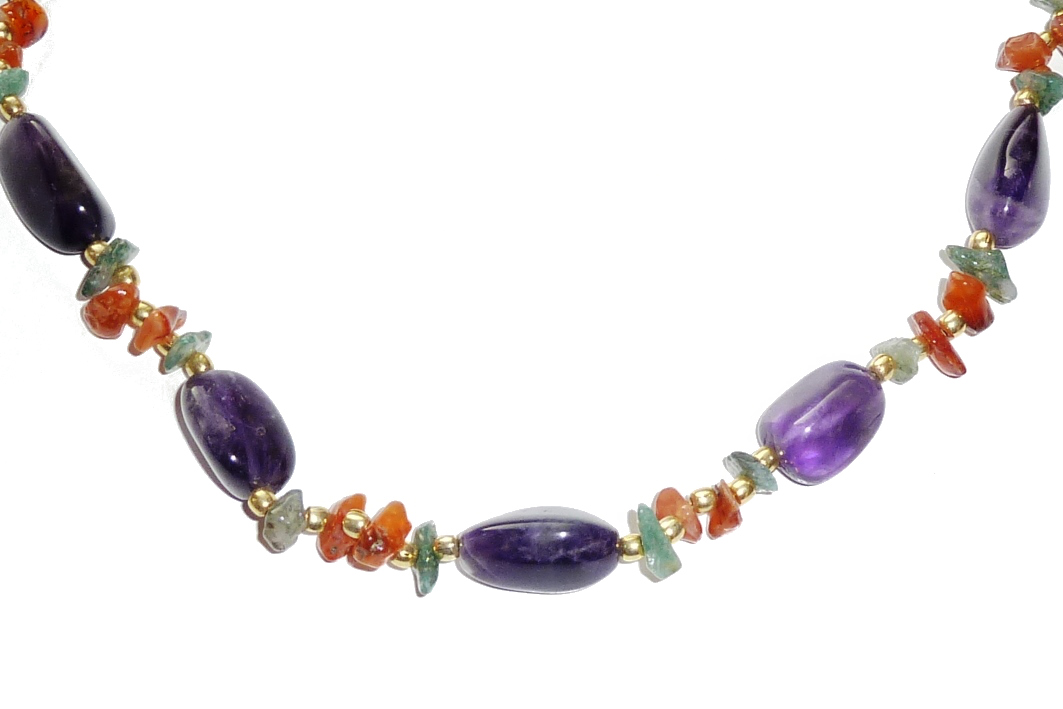 Amethyst Tri Corners with Carnelian and Aventurine Chips, Gold Plated Beads, Gold Plated Trigger Clasp and Jump Ring, 60cm (24″). Pack of 2 Necklaces.