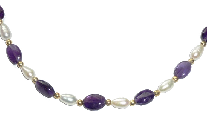 Amethyst Flat Ovals with Freshwater Pearls, Gold Plated Beads, and Gold Plated Trigger Clasp and Jump Ring, 60cm (24″) .