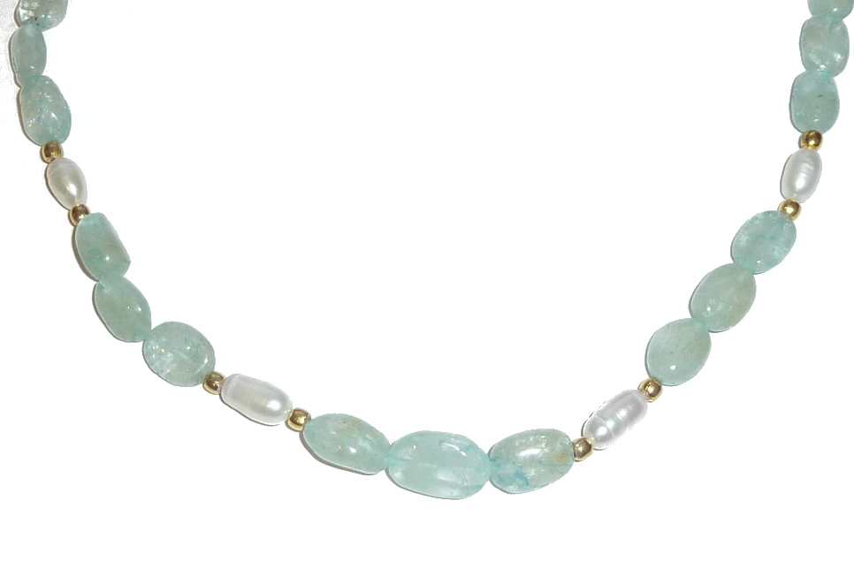 Aquamarine flat oval necklace with freshwater pearls, gold plated beads and trigger clasp, 45cm(18″).